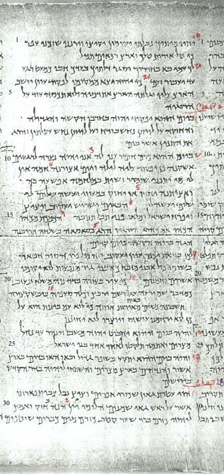 Paragraphs and spatiums: There are 7 paragraphs marked on this page. More than usual. There are 4 spatiums and one indentation in line 22. New paragraphs begin on line: 3 = 26:20; line 7 = 27:1; line 10 = 27:2; line 18 = 27:9; line 24 = 27:12; line 26 = 27:13; .line 29 = 28::1. The indentation on line 22 does not correspond with any verse nor is there a break in thought at that point. There are spatiums in line: 4 = vs 26:21; line 14 = vs 27:6; line 15 = vs 27:7; line 20 = vs 27 10.