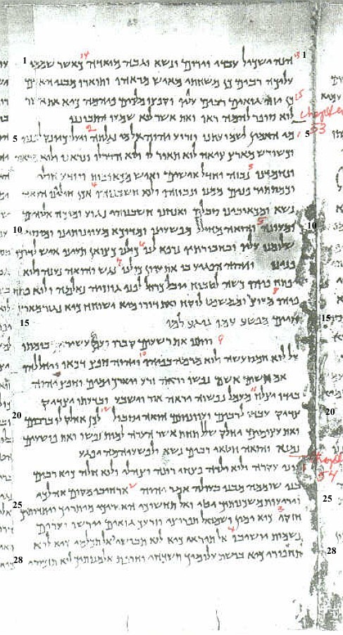 Line 16: 1st word: Q = "va-yitenu" cj + imp 3mpl (and they shall give) and M = "va-yiten" cj + imp 3ms ( and he shall give) 4th word: See under Editorial Additions above. 5th word: Q = "'ashiyriym" (wealthy ones) but it appears that an attempt to erase the plural ending was made; and M = " 'ashiyr" (wealth or wealthy)