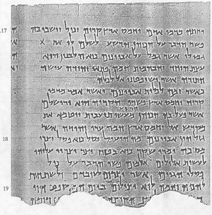 This verse begins with the last word in the next to last line "hoy" (woe) and then the rest of the verse is fragmented most being lost in the lacuna at the bottom of the page. It appears on the first letter on the next line that the scribe wrote a he or article possibly attached to the participle " 'omer" (one speaking) and then parts of the next word "la'ets" (to a tree) can be seen and the next word "haqitsah" is intact. The lacuna then obliterates the next word "le'eben" (to a stone) the final nun being seen and the next word "dumam" (silent or dumb) is intact. The rest of the verse is lost in the lacuna at the bottom of the page.